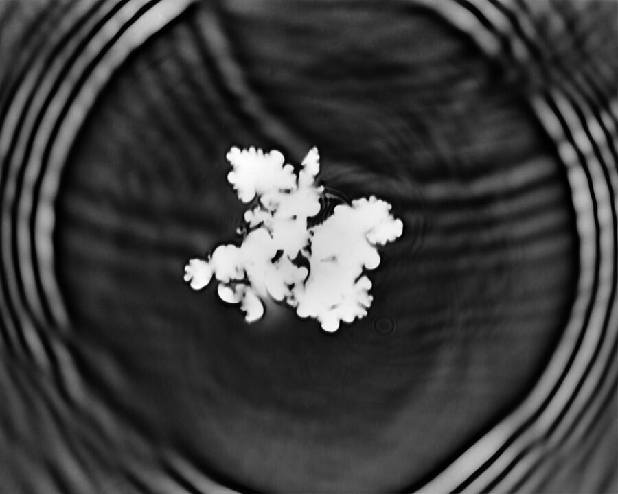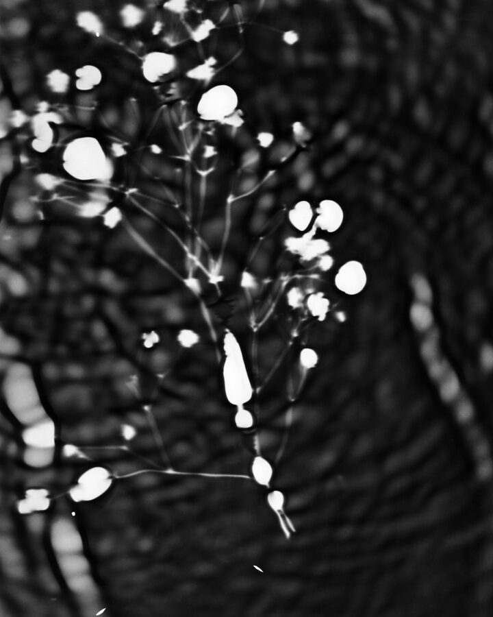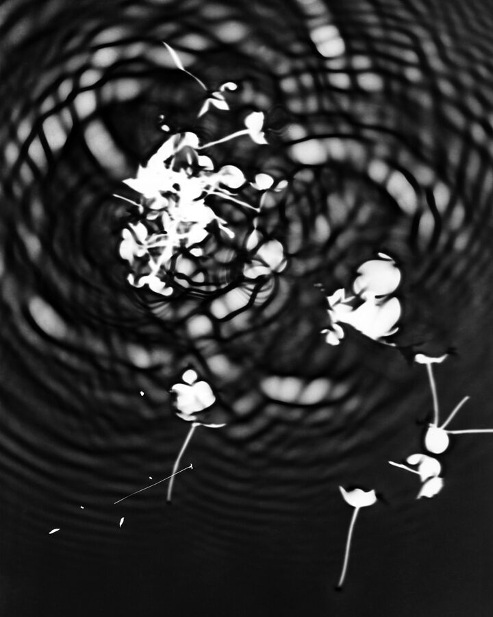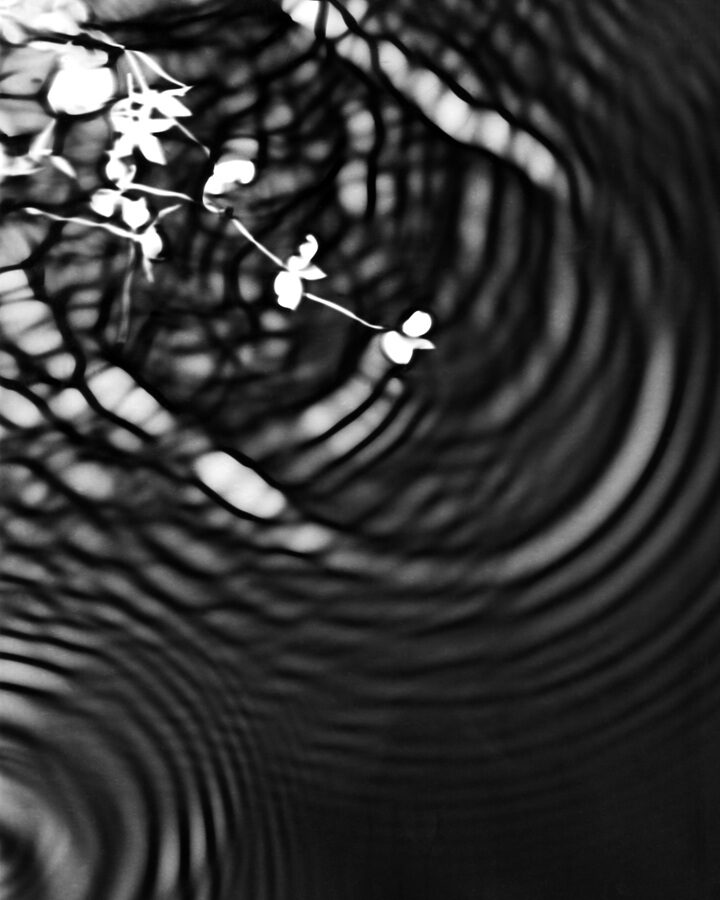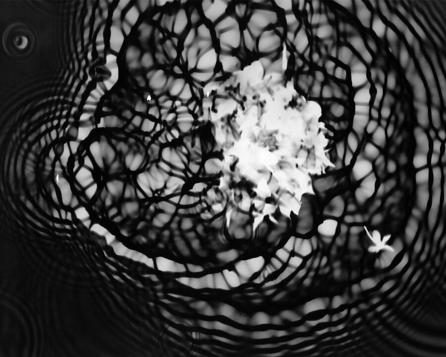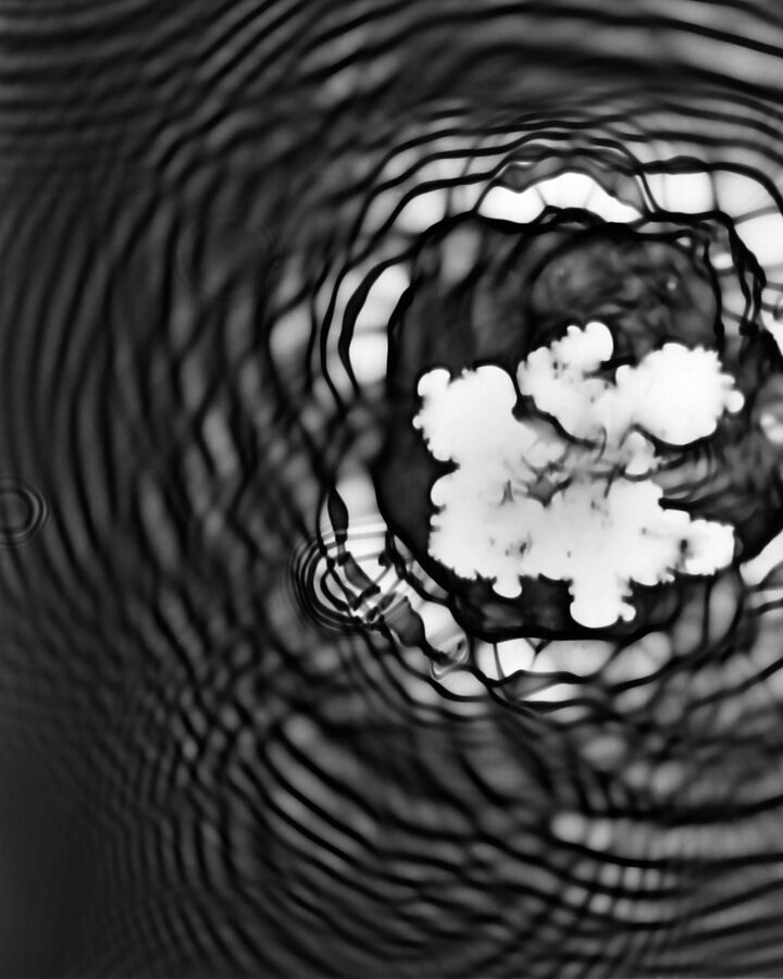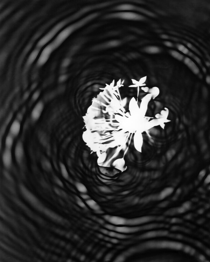 In the darkroom, I let light strike mid‑development so that ripples and flowers inscribe themselves. These fleeting illusions accept uncertainty: a dialogue between design and accident. Black and white heightens contour and echo, making the instant feel both fragile and enduring.